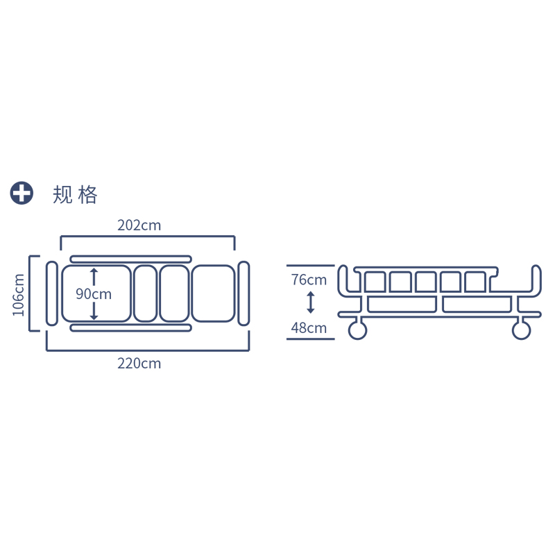 | 产品参数 | 整体长度:220cm;整体宽度:106cm;升降高度:48 - 76cm;床面板长度:202cm;床面板宽度:90cm;床面至地面高度:48 - 76cm; |