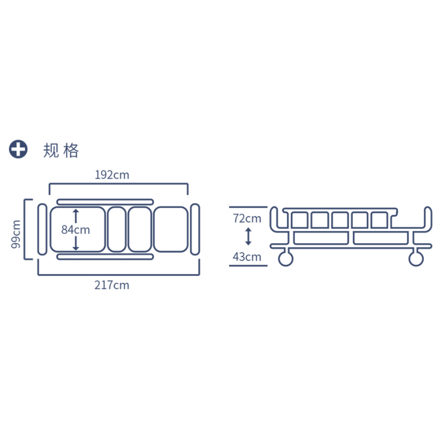 | 产品参数 | 整体长度:217cm;整体宽度:99cm;升降高度:43 - 72cm;床面板长度:192cm;床面板宽度:84cm;床面至地面高度:43 - 72cm; |