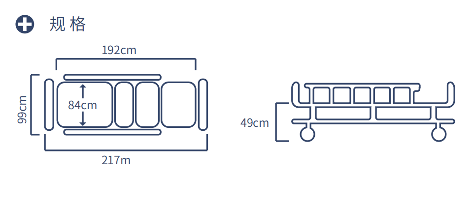 | 产品参数 | 整体长度:217cm;整体宽度:99cm;床面板长度:192cm;床面板宽度:84cm;床面至地面高度:49cm; |