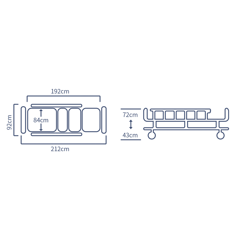 | 产品参数 | 整体长度:212cm;整体宽度:92cm;升降高度:43 - 72cm;床面板长度:192cm;床面板宽度:84cm;床面至地面高度:43 - 72cm; |