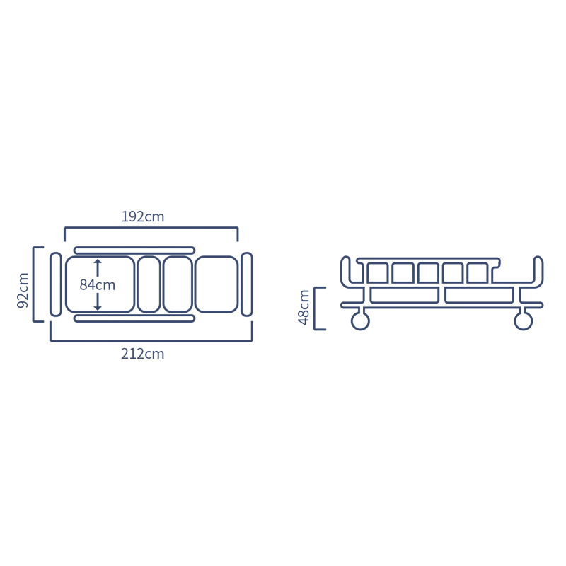| 产品参数 | 整体长度:212cm;整体宽度:92cm;床面板长度:192cm;床面板宽度:84cm;床面至地面高度:48cm; |