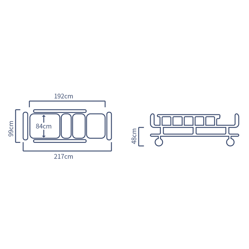 | 产品参数 | 整体长度:217cm;整体宽度:99cm;床面板长度:192cm;床面板宽度:84cm;床面至地面高度:48cm; |