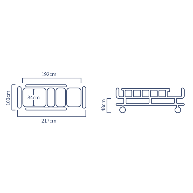 | 产品参数 | 整体长度:217cm;整体宽度:103cm;床面板长度:192cm;床面板宽度:84cm;床面至地面高度48cm; |