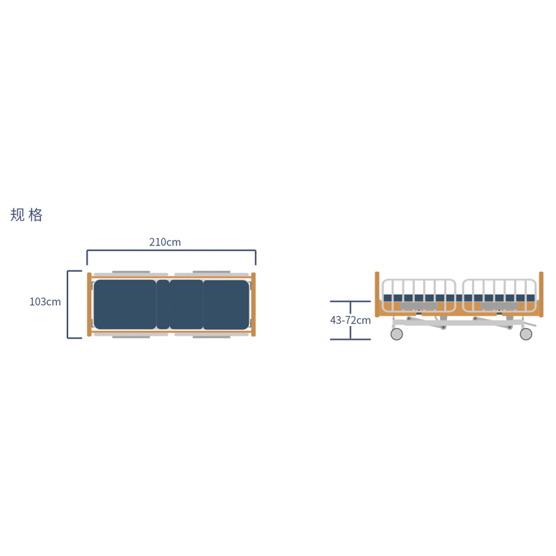 | 产品参数 | 整体长度:210cm;整体宽度:103cm;升降高度:43 - 72cm;床面板长度:192cm;床面板宽度:84cm;床面至地面高度:43 - 72cm; |